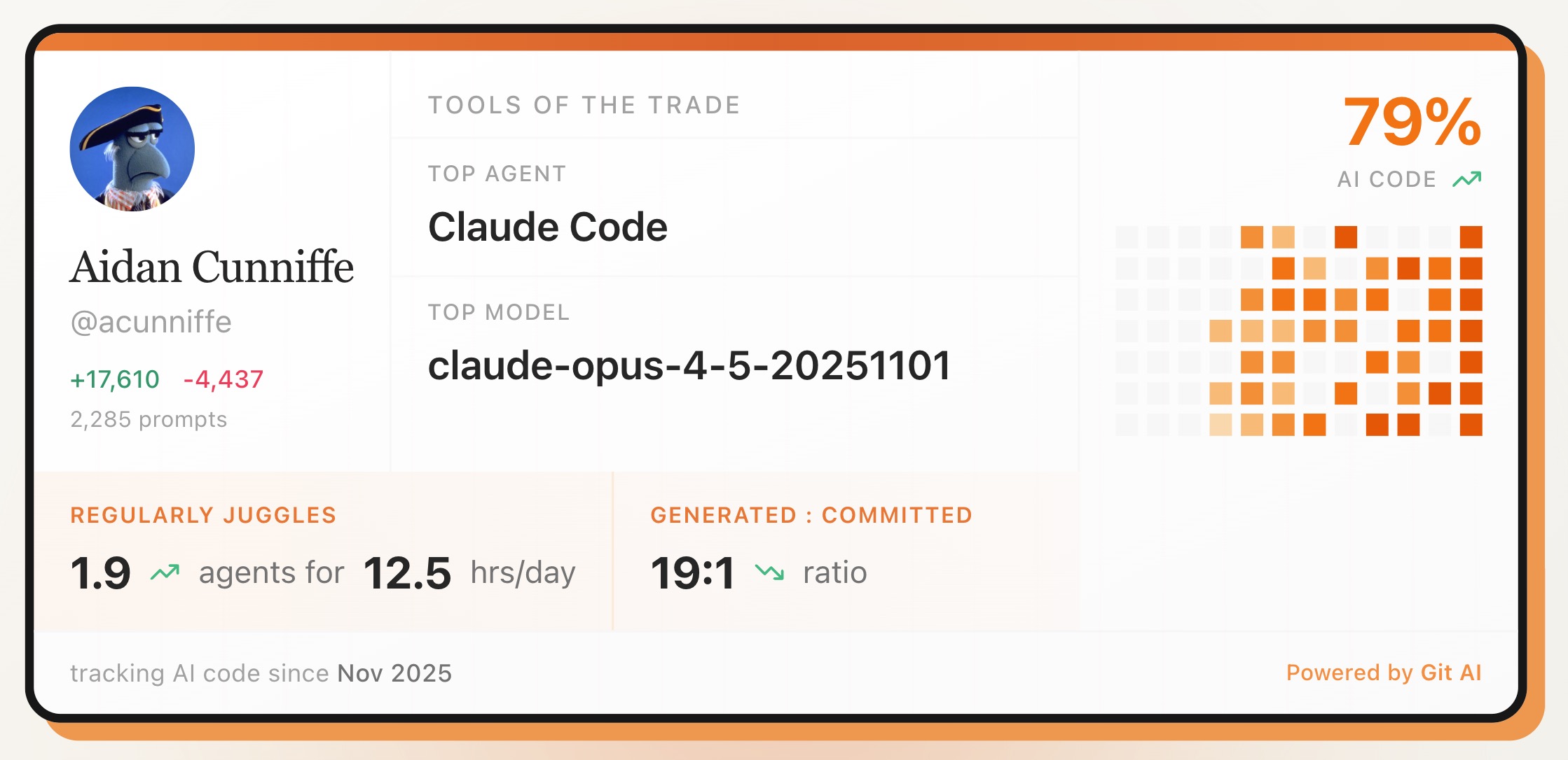 Every developer is figuring how to fit Coding Agents into their development workflow. Git AI's personal dashboard measures several key stats: